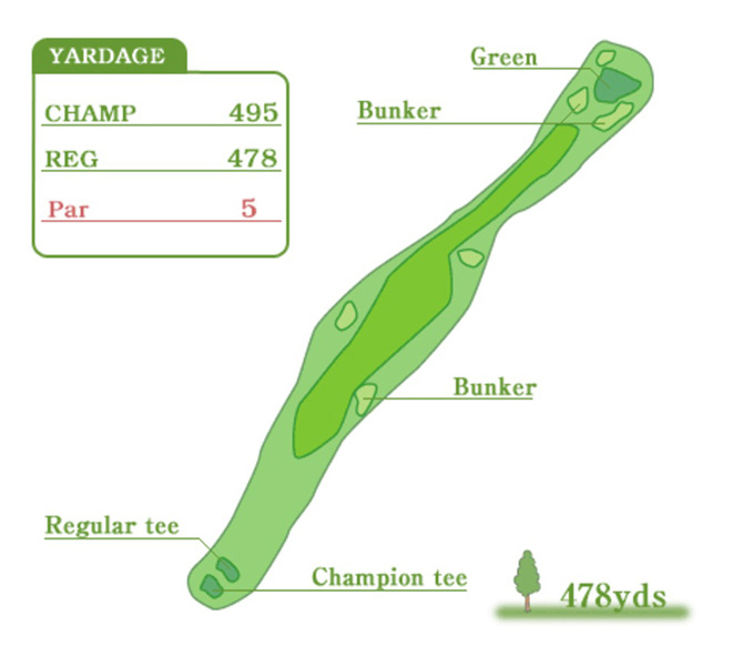 ストレートなロングホールです。ティショットはフェアウェイ右サイドのバンカー狙いでよいでしょう。ただし、斜面の上までいくとOBです。左にOBはありません。ロングヒッターの方は2オンも可能ですが、グリーン奥と左はすぐOBとなっているので注意が必要です。