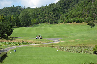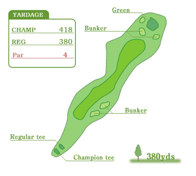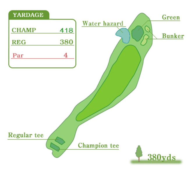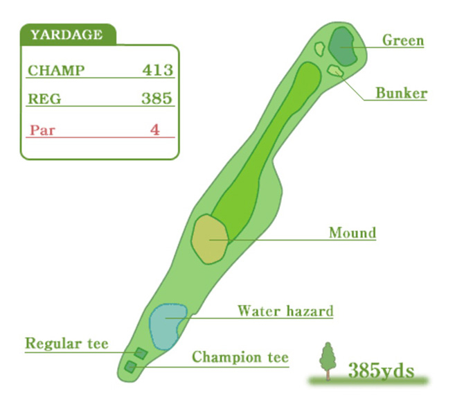 やや打ち上げのミドルホールです。セカンド地点の右サイドは狭く、公林を越えるとすぐOBです。ティショットは左斜面の中腹から山裾を狙うと良いでしょう。左斜面を越えるとその先は比較的広くなっています。