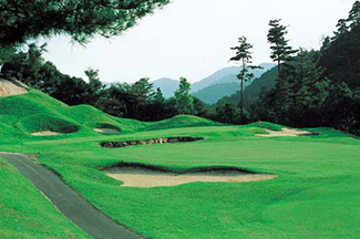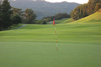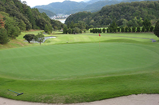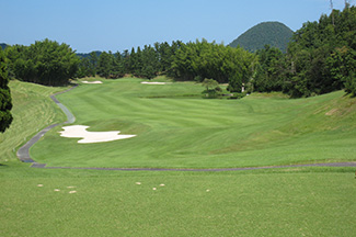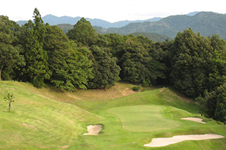 ティショットは打ち上げ、セカンドショット以降は打ち下ろしのミドルホールです。1打目は正面の山に見える大文字を狙ってください。左右共にOBがあり、ティショットがOBの場合はプレイイング4にて、プレーしてください。