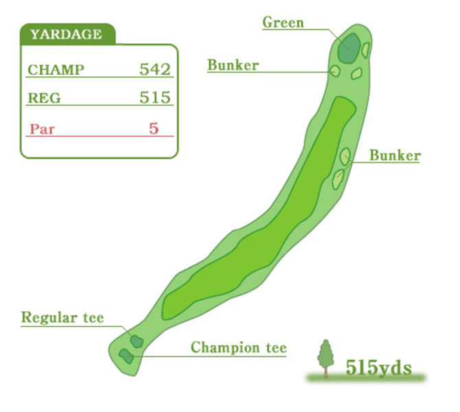 左ドックレッグのロングホールです。ティショットはフェアウェイの1本木を狙うとよいでしょう。ただしロングヒッターの方の場合は右サイドへ突き抜ける可能性がありますので、左サイドを狙いましょう。右は林、左は斜面の上へいくとOBです。セカンドショット以降はフェアウェイの左サイドを狙っていきましょう。