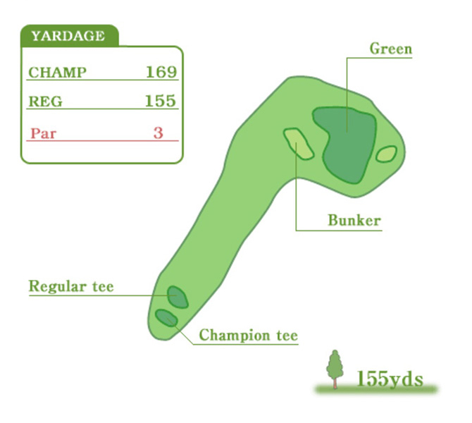 やや打ち下ろしのショートホールです。グリーンは斜めに広くなっているのでピンが左サイドにあるときと、右サイドにあるときとではクラブの選択が違ってきますので要注意です。