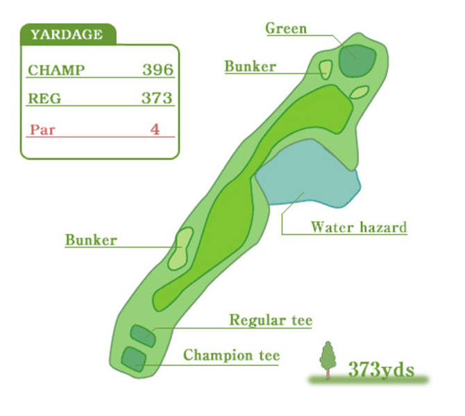セカンドショットが池越えとなるミドルホールです。ティショットは風とティ位置によってクラブの選択に注意が必要です。