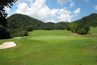 打ち下ろしのショートホールです。グリーンの右と手前はOBです。左は広く、斜面をうまく使えばグリーンオンも可能です。グリーンは縦に長く、ピンの位置が手前と置くとでは50ヤード以上と違ってきますのでクラブの選択がカギです。