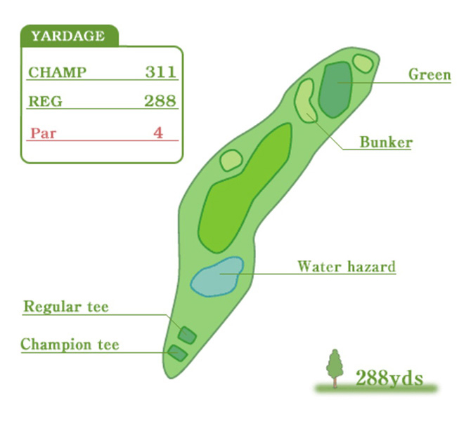 セカンドショットが池越えとなるミドルホールです。ティショットは風とティ位置によってクラブの選択に注意が必要です。
