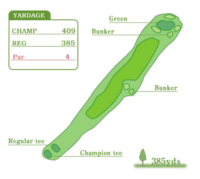グリーン手前のバンカーは深くあごが高いので要注意です。セカンドショットは無理をせず、グリーン右手前の1本木を狙うのがベストです。ティショットがOBの場合は、特設ティからプレイング4でプレーしてください。CHAMPION REGULAR 512 487 -